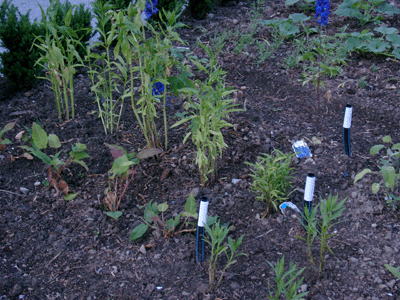 Das Foto zeigt das Mutterpflanzenquartier, welches Stecklinge für die Vermehrung liefert. Wichtig hierbei ist die Beschilderung, die eine Sortenzuordnung sicherstellt.