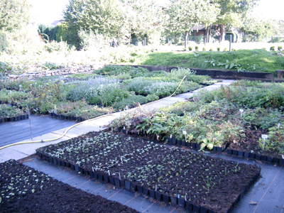Getopft wird größtenteils per Schüttverfahren. Dabei werden leere Töpfe (ca. 500/Einheit) in einen eigens dafür konzipierten Stellrahmen gestellt und Schiebkarrenweise mit Substrat beschüttet. Danach wird das Substrat gleichmäßig mit der Rückseite einer Harke verteilt. Nun sind die Töpfe vorbereitet für die Jungpflanzen, welche mittels einer Ausdrückplatte aus den Multiplatten gelöst werden und in die Töpfen gepflanzt werden. Als Substrat wird eine Einheitserde mit Langzeitdünger und einem gewissen Anteil an Ton verwendet. Kreisregner sorgen für eine gleichmäßige Bewässerung. Ausgelegt ist die gesamte Stauden-Produktionsfläche mit wasserdurchlässigem Bändchengewebe (MyPex©), wodurch Unkrautbildung unterdrückt wird. Zudem wird einerseits Staunässe und andererseits der Verlust von Bodenfeuchtigkeit verhindert.